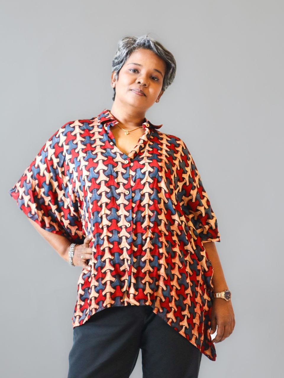 Expertly crafted using traditional handblock printing, this eye-catching kaftan top features a striking repeating geometric pattern in vibrant shades of red, navy blue, and soft peach/cream. Each motif is meticulously hand-stamped by skilled artisans, giving the fabric a rich texture and unique artisanal character.